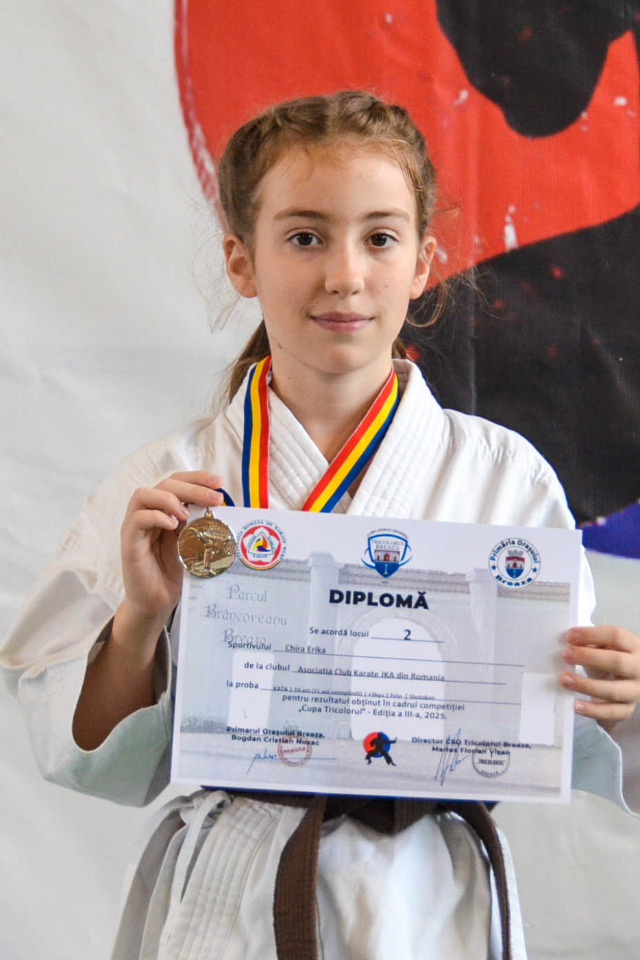 Breaza – Atmosfera a fost intensă și plină de energie la Cupa Tricolorul Karate WUKF, acolo unde sute de sportivi din toată țara s-au întrecut în tehnică, disciplină și determinare. Printre ei s-a remarcat Chira Erika, sportivă a clubului CS Karate JKA România, care a urcat de două ori pe podium, obținând două medalii de argint, la probele de kata individual și kata sincron.