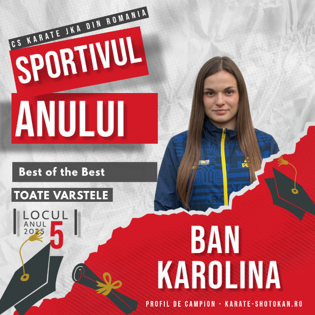 Anul competițional 2025 a confirmat statutul de sportiv de elită al Ban Andrea Karolina, sportivă a CS Karate JKA România, care a fost evidențiată în categoria Best of the Best, ocupând locul V (5) în clasamentul final Sportivul Anului 2025, realizat pe baza punctajelor obținute în Top 100 – Sportivul Anului.