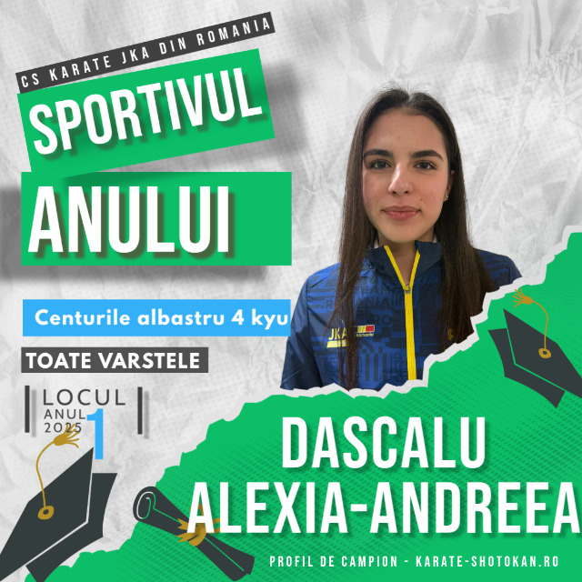 Anul competițional 2025 a reprezentat un reper important în parcursul sportiv al Dascălu Alexia Andreea, sportivă a CS Karate JKA România, desemnată Sportivul Anului 2025 – Locul I, categoria 4 kyu, în cadrul clasamentului oficial Top 100 – Sportivul Anului.
