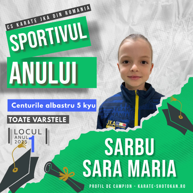 Anul sportiv 2025 a marcat un moment important în evoluția Sârbu Sara Maria, sportivă a CS Karate JKA România, desemnată Sportivul Anului 2025 la categoria Centura Albastră – 5 Kyu, în cadrul clasamentului oficial Sportivul Anului.
