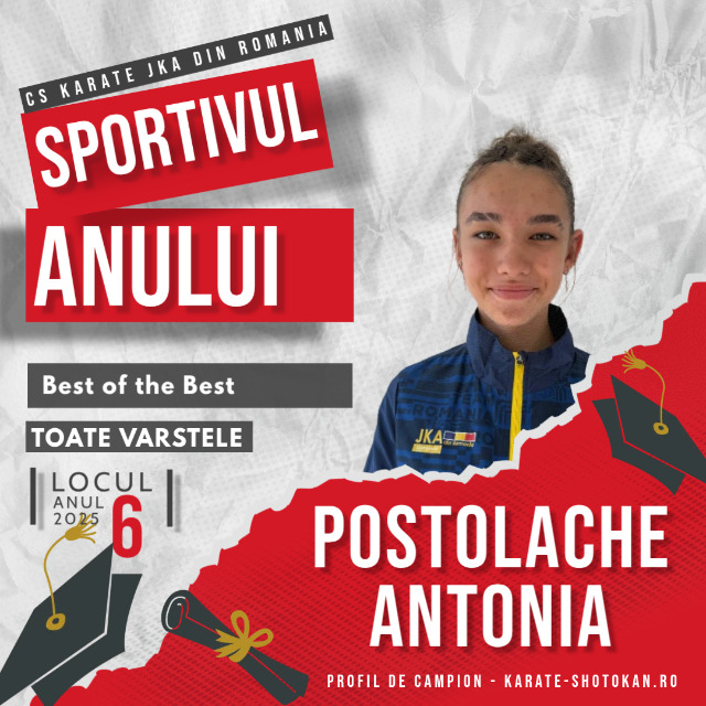 Anul competițional 2025 a reconfirmat evoluția și dedicația Postolache Antonia, sportivă a CS Karate JKA România, care a fost evidențiată în categoria Best of the Best, ocupând locul VI în clasamentul final Sportivul Anului 2025, realizat pe baza punctajelor obținute în Top 100 – Sportivul Anului.