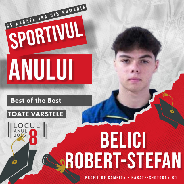 Anul competițional 2025 a reprezentat un pas important în evoluția sportivă a lui Belici Robert, sportiv al CS Karate JKA România, care a încheiat sezonul pe Locul VIII în clasamentul Top 100 – Sportivul Anului 2025. Această clasare confirmă munca depusă pe parcursul anului și poziționează sportivul printre cei mai buni karateka ai clubului.